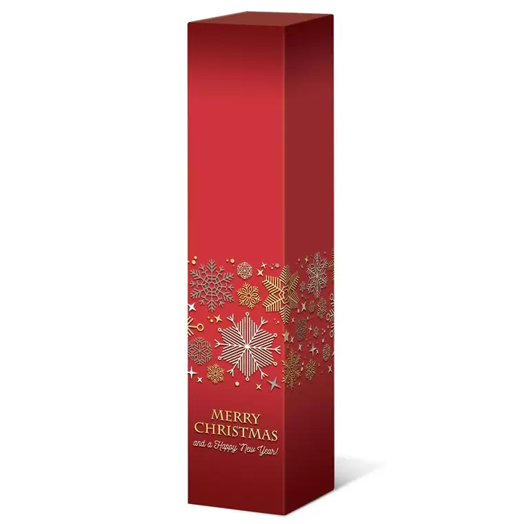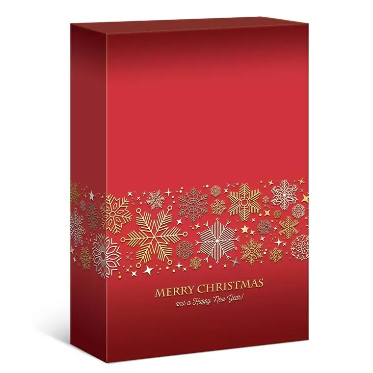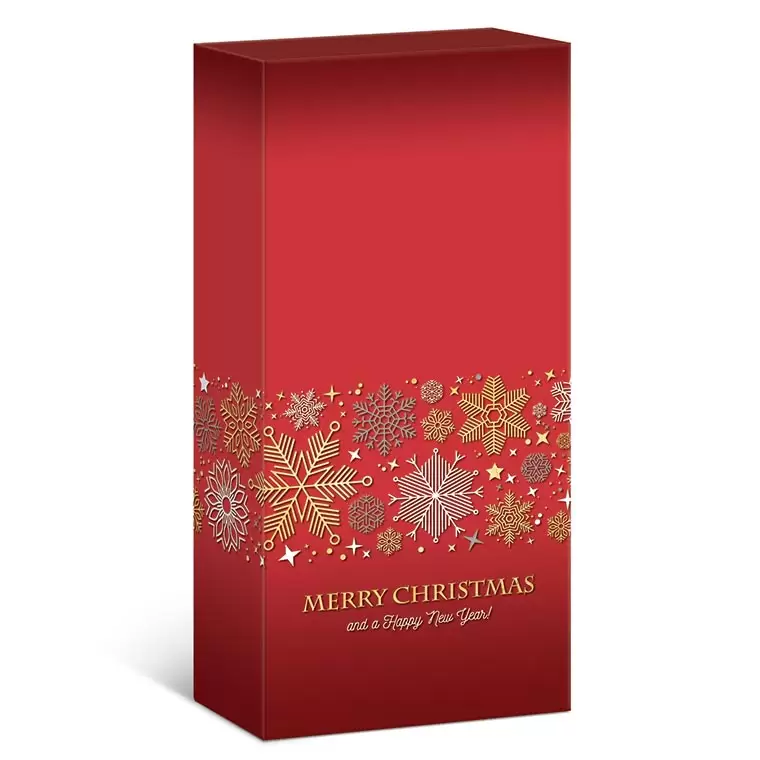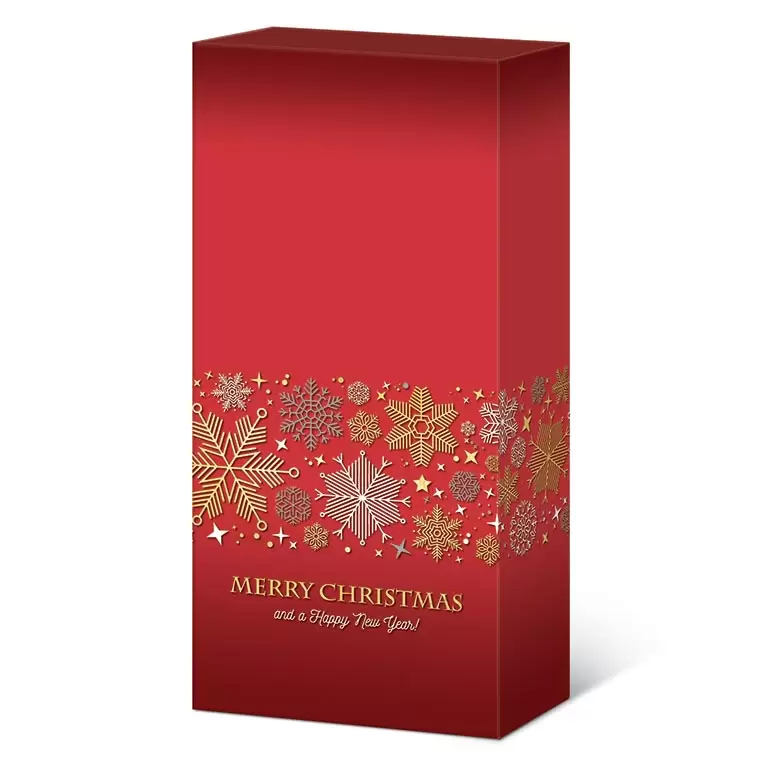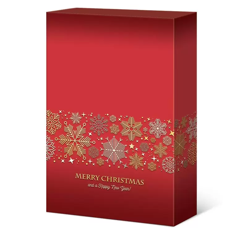 Etui à fond automatique avec bandeau de flocons de neige blancs, argentés, dorés, mats et brillants sur fond lisse rouge mat. Intérieur et intercalaire coloris naturel.