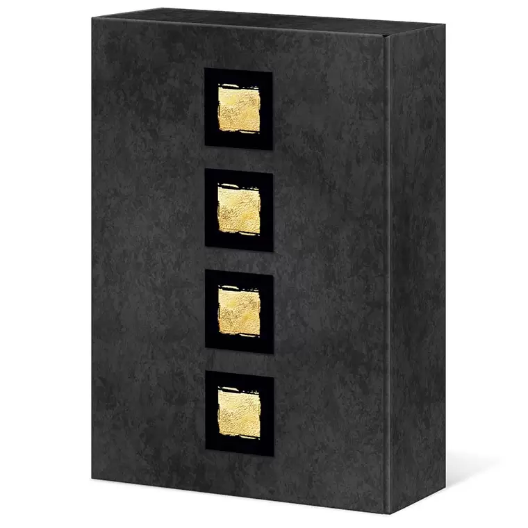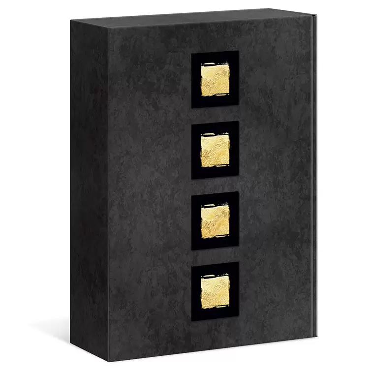 Coffret couché noir, anthracite et gris chiné mat avec estampage doré en relief.Intérieur et intercalaire noir