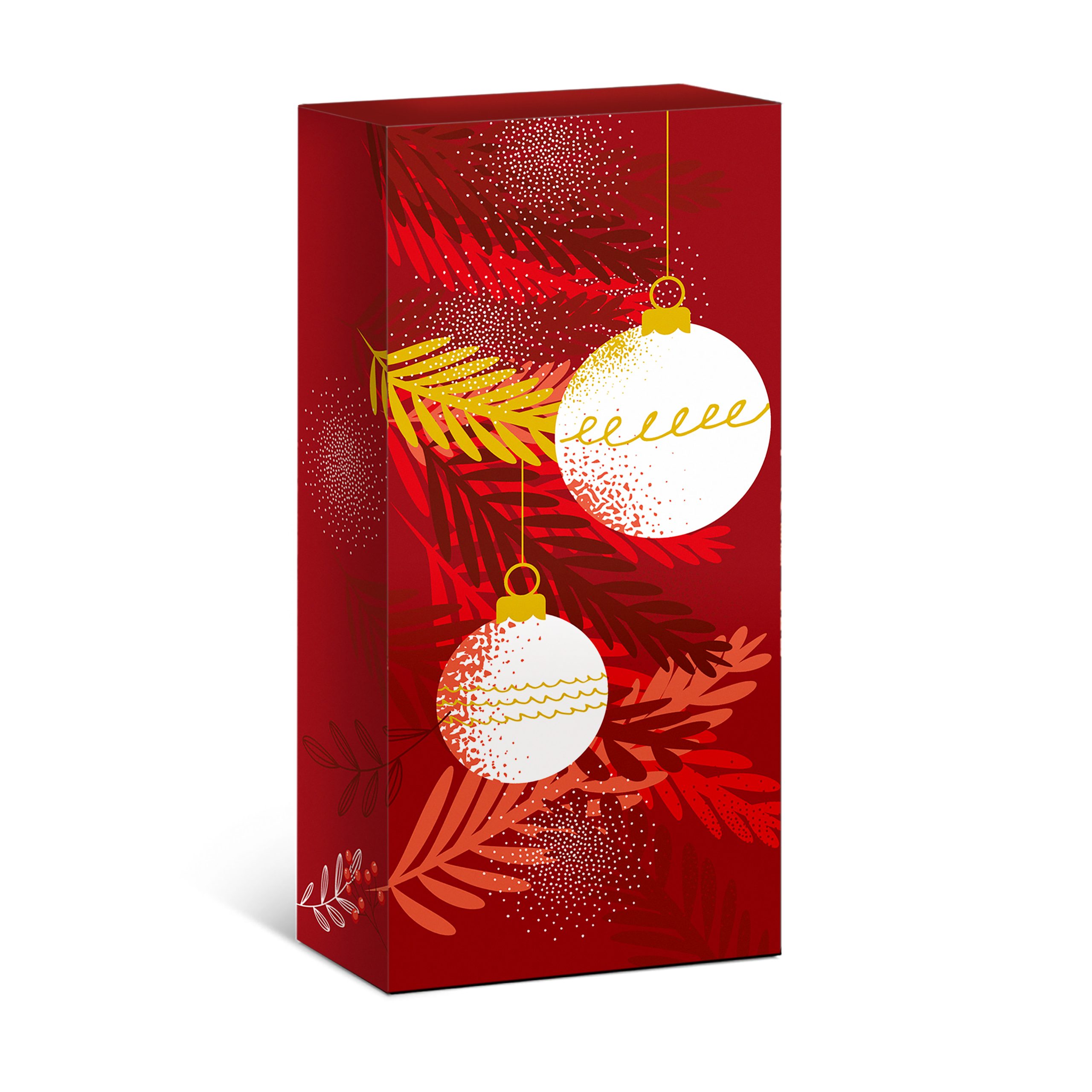 Etui à fond automatique avec motif de Sapin et Boules de Noël en nuance rouge, jaune et blanc. Sur fond lisse. Avec séparations incorporées.