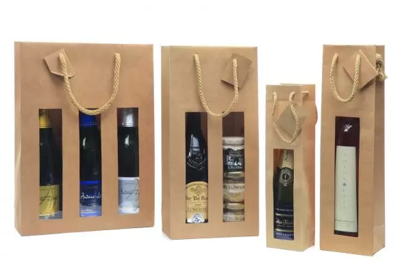 Sac en kraft 175 grs avec fenêtre, cordelière coton et livret perforé pour messages cadeaux (sac 3 btles fourni avec carton séparateur de bouteilles)