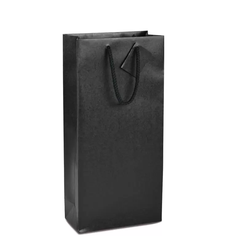 Sac kraft noir mat 175 grs, finition haut de gamme, avec cordelière coton et étiquette perforée pour messages cadeaux.
