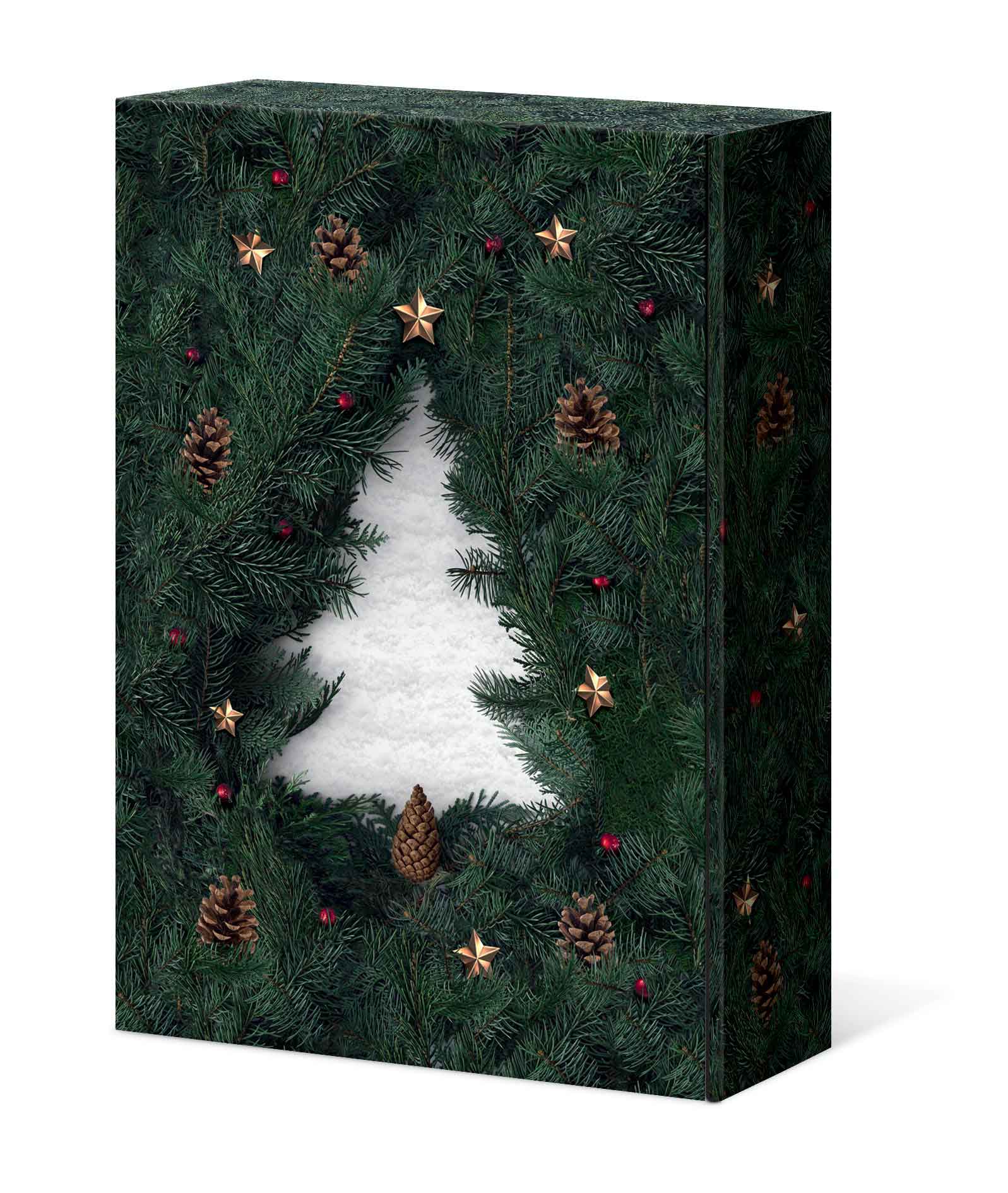 Coffret couché avec surface lisse et vernis parfumé à l’odeur de sapin. Intérieur et intercalaire teinté noir.