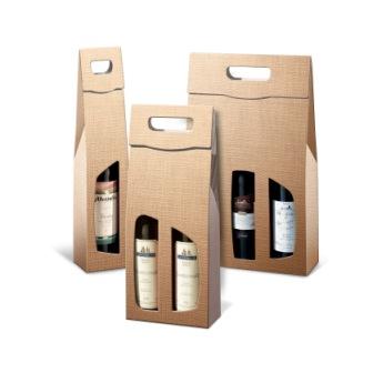 Etui portable aspect tissé pour vin et Champagne, avec grandes fenêtres et poignée incorporée.