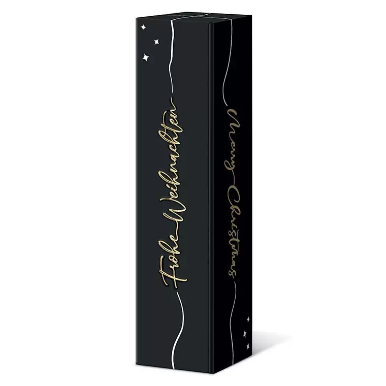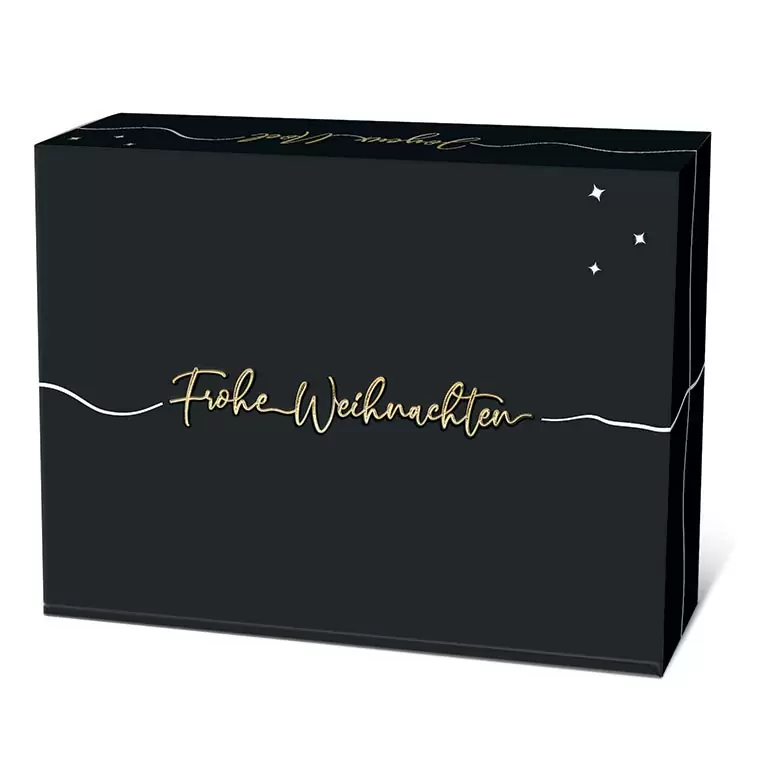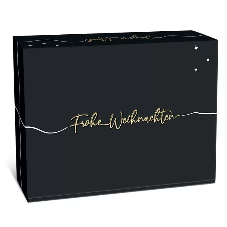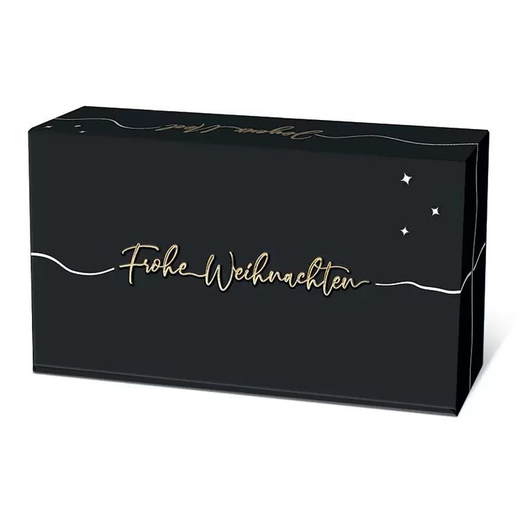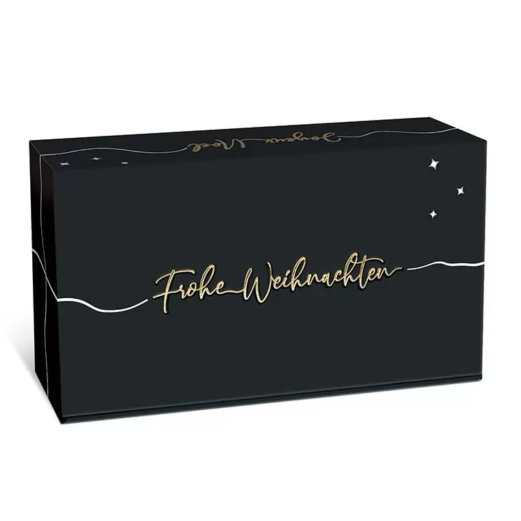 Coffret couché noir lisse associant les vœux de Noël dorés en 3 langues. Intérieur et intercalaire noir.